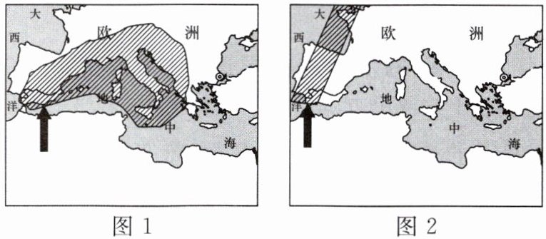 9. 欧洲人从 15 世纪后半期开始探寻新航路,图 1 和图 2 箭头所指的阴影部分分别代表近代初期前后出现的欧洲的贸易中心区。图 1 到图 2 的变化说明新航路的探寻( )