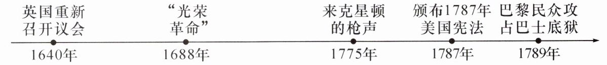 1640年英国重新召开议会—1688年“光荣革命”—1775年来克星顿的枪声—1787年颁布美国宪法—1789年巴黎民众攻占巴士底狱