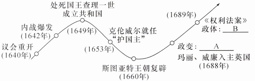 材料一 下图为小丽同学在学习英国资产阶级革命时所绘制的思维导图。(处死国王查理一世—成立共和国(1649年);内战爆发(1642年)—克伦威尔就任“护国主”(1653年);议会重开(1640年)—斯图亚特王朝复辟(1660年)—玛丽、威廉入主英国(1688年)—(1689年)《权利法案》,政体:B;改变:A)