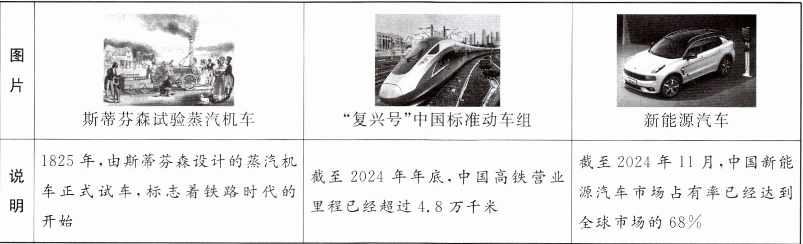 | 说明 | 1825年,由斯蒂芬森设计的蒸汽机车正式试车,标志着铁路时代的开始 | 截至2024年年底,中国高铁营业里程已经超过4.8万千米 | 截至2024年11月,中国新能源汽车市场占有率已经达到全球市场的68% |