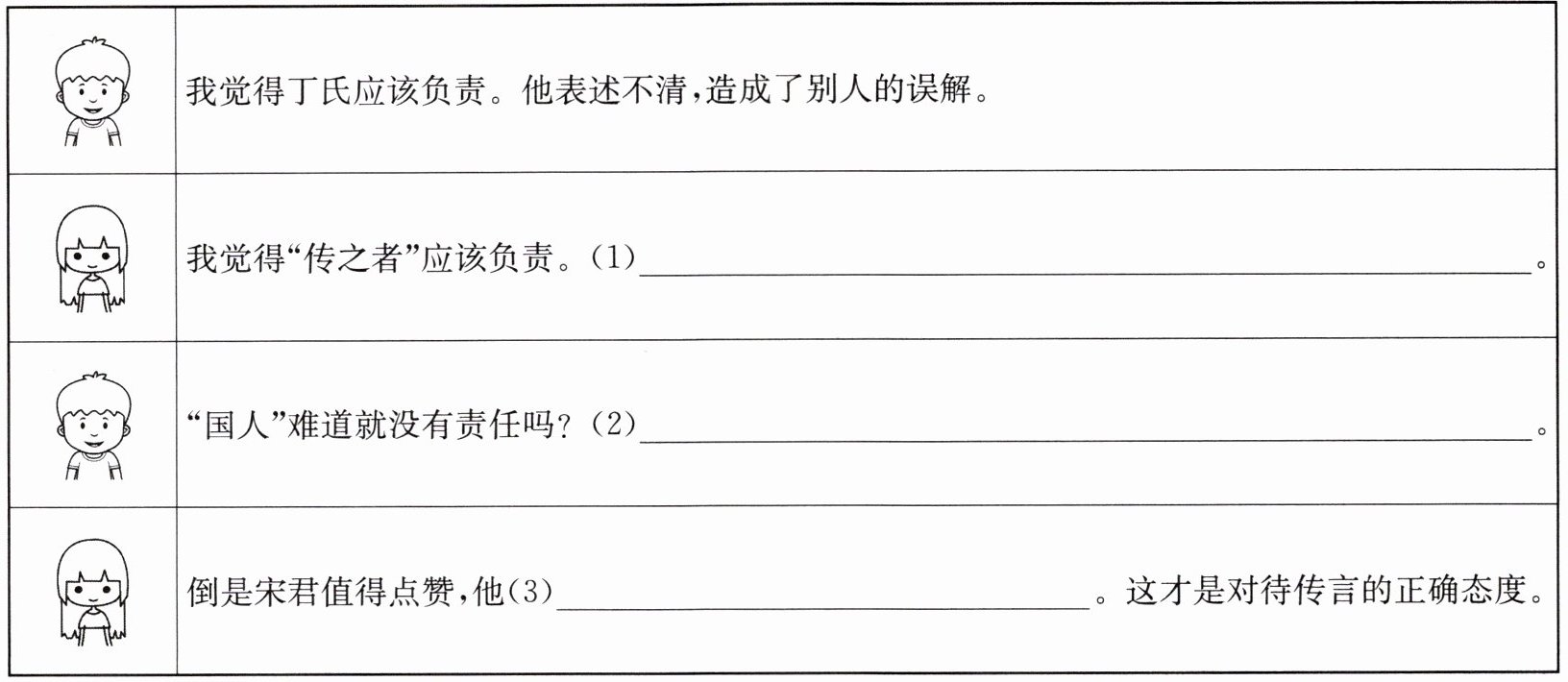 6.【情境设题】文中谣言的传播应该由谁负责?请你参与讨论并补全对话。(3分)