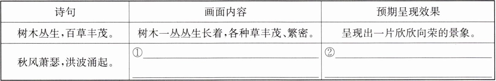 6.示例:①萧瑟的秋风中,大海波澜壮阔、汹涌起伏。 ②显示出大海的辽阔和威严/显示出大海的恢宏壮阔。(每空1分)