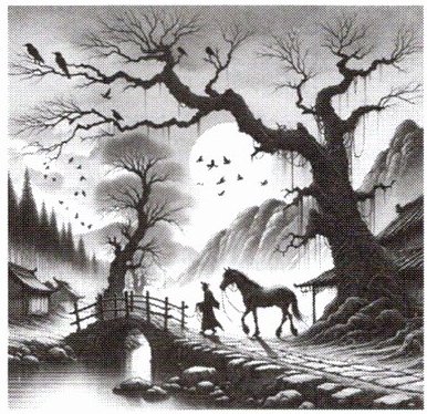 A图片选取枯藤老树这些最有特征性秋景给人以萧条寂寞悲凉感觉B图片左侧是潺潺流水温暖人家这些充满生活气息的景象,一扫游子内心悲凉C图片中间一人一马立于枯树之下望着流水人家尽显"断肠人"天涯沦落之感D图片中可见夕阳低垂既点明游子思乡特定时间又渲染悲凉氛围使画面情景交融浑然一体16小语在研读这首元曲时认为把"古道西风瘦马"中"瘦马"改为"骏马"更好,你赞同这个观点吗?请阐述理由(3分)17"枯藤老树昏鸦""古道西风瘦马"都营造出苍凉的意境,"小桥流水人家"穿插其中是否会不协调?请说明理由(3分)18古人云"三分诗七分吟"学习古诗词离不开朗读你准备用怎样的语调朗读《天净沙·秋思》呢?请结合具体内容简要说明(3分)