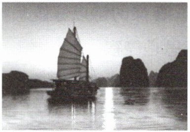 示例二:潮平两岸阔,风正一帆悬。(1分)这幅作品借广阔的江面和高悬的船帆,表达开阔的心境与豪放的激情。(1分)