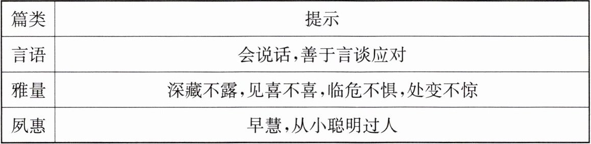 (2)诚实、自信的形象,他们认为自己记住了大人的谈话内容,并且敢于表达出来 4.乙文出自《夙惠》篇。理由:元方和季方在煮饭时忘记放箅子,导致饭煮成了粥,但他们能专心听父亲与客人谈话,并能记住谈话内容,且在父亲询问时,能自信地回答,表现出他们从小聪明过人的特点,符合《夙惠》篇中早慧的特点。