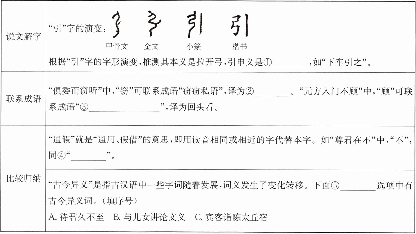 ★1【任务积累词语】积累言词语做到触类旁通运用表格法整理言文字词(5)说文解“引”字演变:甲骨文金文小篆楷书根据引字字形演变推测其本义是拉开引申义① 如“下车引之”。联系成语“俱委窃听”中“窃”可联系成语“窃窃私语”译为② “元方入门不顾”中“顾”可联系成语“③ ”译为回头看通假就是“通用假借意思即用读音相同或相近字代替本字如“尊君不"中“不”同④ “古今异义"是指古汉语中些字词随着发展词义发生了变化转移下面⑤ 选项中有古今异义词(填序号)A待君久不至B与儿女讲论文义C宾客诣陈太丘宿