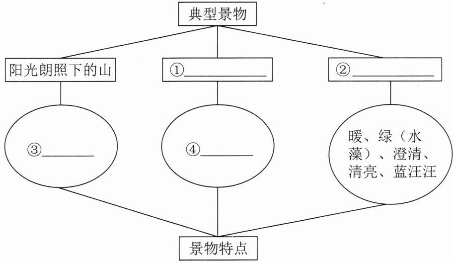 4.【思维导图】【内容梳理】阅读写景散文要抓住文章选取的典型景物及其主要特点。下图是课文所描写的三个典型景物及其特点,请梳理课文内容,补全下图。(4 分)
