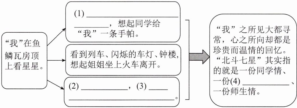 1.【思维导图】小语对文章标题感到疑惑,他觉得标题说的是在房顶上看“北斗七星”,但全文写 “北斗七星"却只有寥寥几笔。于是,他对文章第①~⑨段进行了梳理,探究其含义,请你补全 content.(4分)