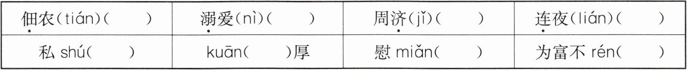 |佃农(tián)( )|溺爱(nì)( )|周济(jǐ)( )|连夜(lián)( )|私 shú( )|kuān( )厚|慰 miǎn( )|为富不 rén( )|