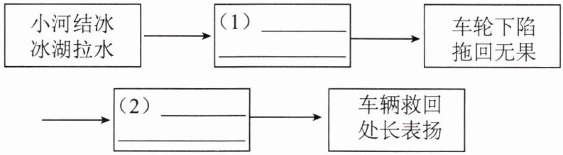 小河结冰→冰湖拉水→(1)______→车轮下陷→拖回无果→(2)______→车辆救回→处长表扬