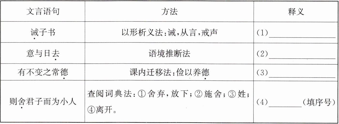 则舍君子而为小人查阅词典法:①舍弃,放下;②施舍;③姓;④离开。(4)(填序号)