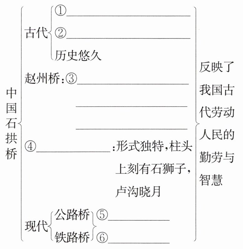 ①形式优美 ②结构坚固 ③世界最古,一个如弓大拱,两肩小拱,结构匀称 ④卢沟桥 ⑤长虹大桥 ⑥双曲拱桥