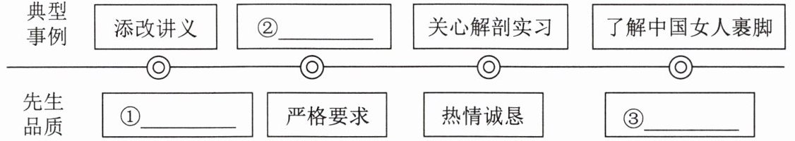 下表是“我”与藤野先生交往的四个典型事例及其表现出的藤野先生的品质,请梳理全文,完成下表。(3分)