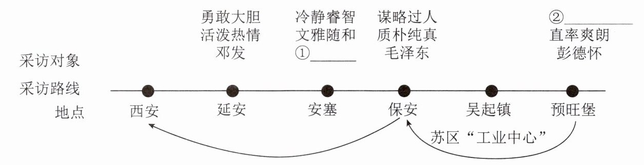 (1)小语同学在阅读《红星照耀中国》后,绘制了一幅斯诺采访“红色中国”的主要路线图。请你帮忙完成下图相对应的内容。