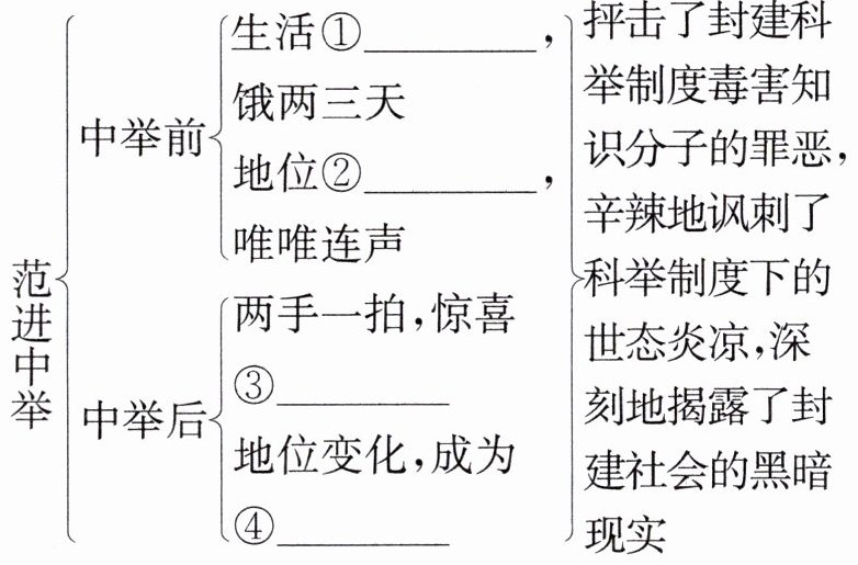 ,唯唯连声} \end{cases} \end{cases} \text{抨击了封建科举制度毒害知识分子的罪恶,辛辣地讽刺了科举制度下的世态炎凉,深刻地揭露了封建社会的黑暗现实} \\ \begin{cases} \text{中举后} \begin{cases} \text{两手一拍,惊喜③发疯