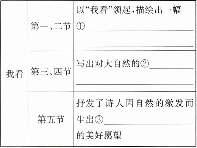 | | 第一、二节 | 以“我看”领起,描绘出一幅