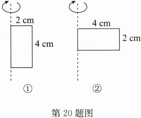 20. (10分)如图,将长和宽分别为4cm和2cm的长方形分别绕图①,②中的虚线轴旋转一周得到两个几何体,所得两个几何体的体积相等吗?如果不相等,哪一个体积较大?