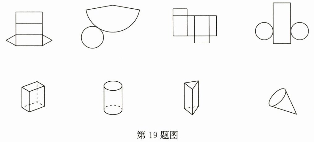19. (8分)如图,上面的图形分别是下面哪个立体图形展开的形状?请你把有对应关系的平面图形与立体图形连接起来。