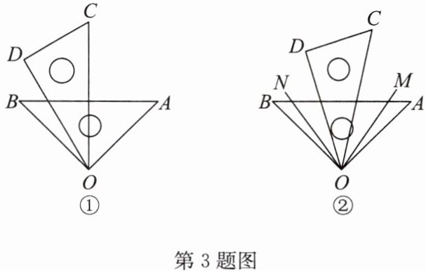 3. 已知将一副三角尺(直角三角尺$OAB和直角三角尺OCD$)的两个顶点重合于点$O$,$∠AOB = 90^{\circ}$,$∠COD = 30^{\circ}$。