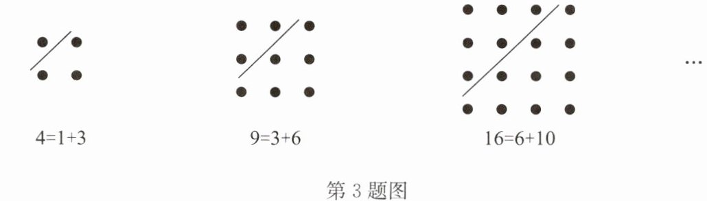 3. 古希腊著名的毕达哥拉斯学派把1,3,6,10…这样的数称为“三角形数”,而把1,4,9,16…这样的数称为“正方形数”。如图,从图中可以发现,任何一个大于1的“正方形数”都可以看作两个相邻“三角形数”之和,则下列符合这一规律的等式是(