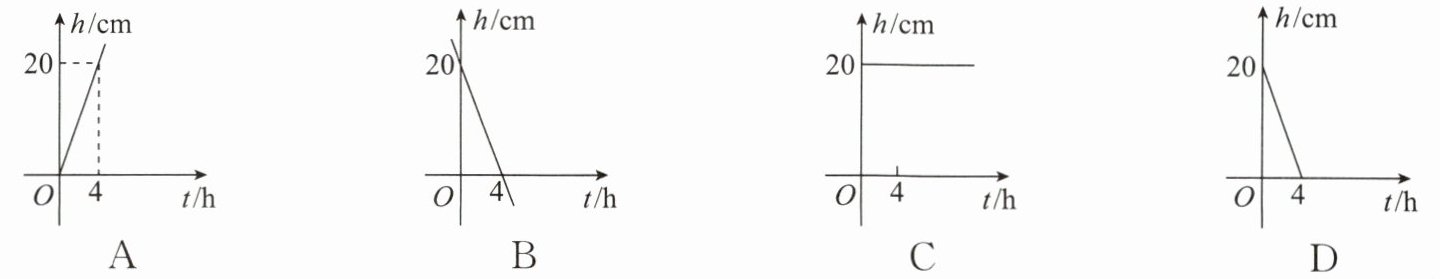 5. 一根蜡烛长20cm,点燃后每小时燃烧5cm,则表示燃烧时剩下的高度$h(cm)与燃烧时间t(h)$的函数关系的图象是 (