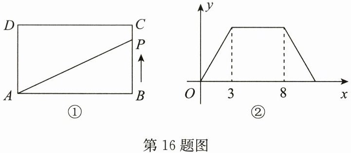 16.如图①,在长方形ABCD中,动点P从点B出发,沿$BC→CD→DA$运动至点A停止,设点P运动的路程为x,$\triangle ABP$的面积为y,如果y关于x的函数图象如图②所示,那么长方形ABCD的周长是______