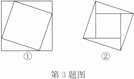 3. 如图,图①②均由四个全等的直角三角形拼接而成,且它们的两条直角边长分别为a,b,斜边长为c,$a>b$. 请选择一个你喜欢的图形,利用等面积法验证勾股定理.
