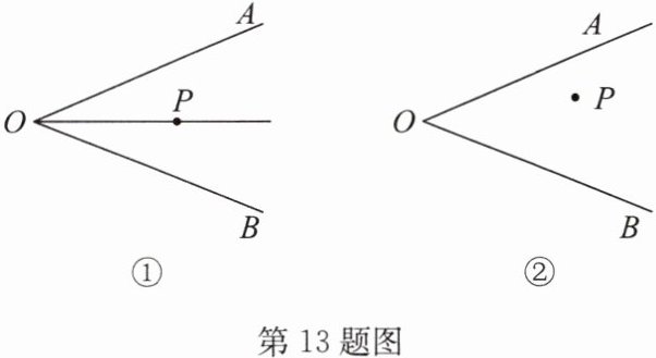 13. (1)如图①, $P$ 是 $\angle AOB$ 的平分线上一点,试过点 $P$ 画一条直线,交 $\angle AOB$ 的两边于点 $C$, $D$,使 $\triangle OCD$ 是等腰三角形,且 $CD$ 是底边;