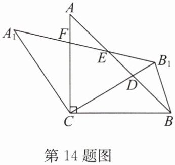 14. 如图,在 $\triangle ABC$ 中, $AC = BC$, $\angle ACB = 90^{\circ}$,将 $\triangle ABC$ 绕点 $C$ 逆时针旋转 $\alpha$ 角 $(0^{\circ} < \alpha < 90^{\circ})$,得到 $\triangle A_1B_1C$,连接 $BB_1$,设 $CB_1$ 交 $AB$ 于点 $D$, $A_1B_1$ 分别交 $AB$, $AC$ 于点 $E$, $F$.