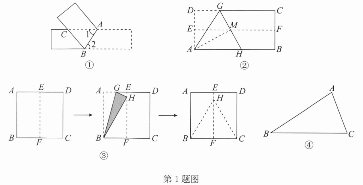 (1)探究一:如图①,在一张长方形的纸片上任意画一条线AB,将纸片沿AB折叠,重叠的部分△ABC一定是______三角形.