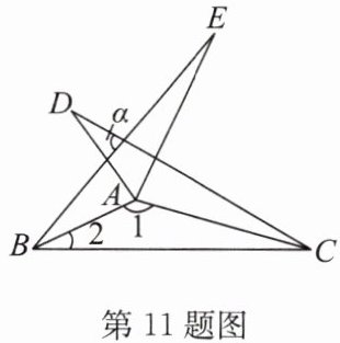 11. 如图,$\triangle ABE\cong \triangle ADC\cong \triangle ABC$,若$∠1= 140^{\circ },∠2= 25^{\circ }$,求$∠α和∠DAE$的度数.