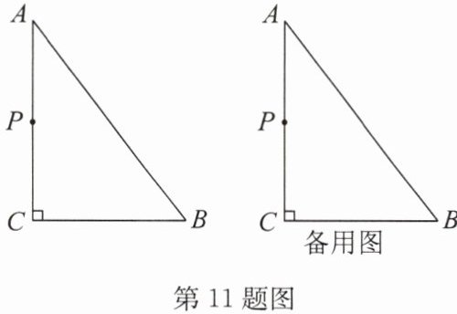 11.如图,在$\triangle ABC$中,$∠ACB= 90^{\circ},AB= 10,BC= 6$,若点P从点A出发,以每秒1个单位长度的速度沿$A→C→B→A$运动,设运动时间为t秒$(t>0)$.
