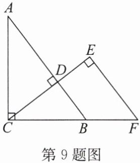 9. 如图,在$Rt△ABC$中,$∠ACB= 90^{\circ }$,过点C作$CD⊥AB$,垂足为D.在射线CD上截取$CE= CA$,过点E作$EF⊥CE$,交CB的延长线于点F.