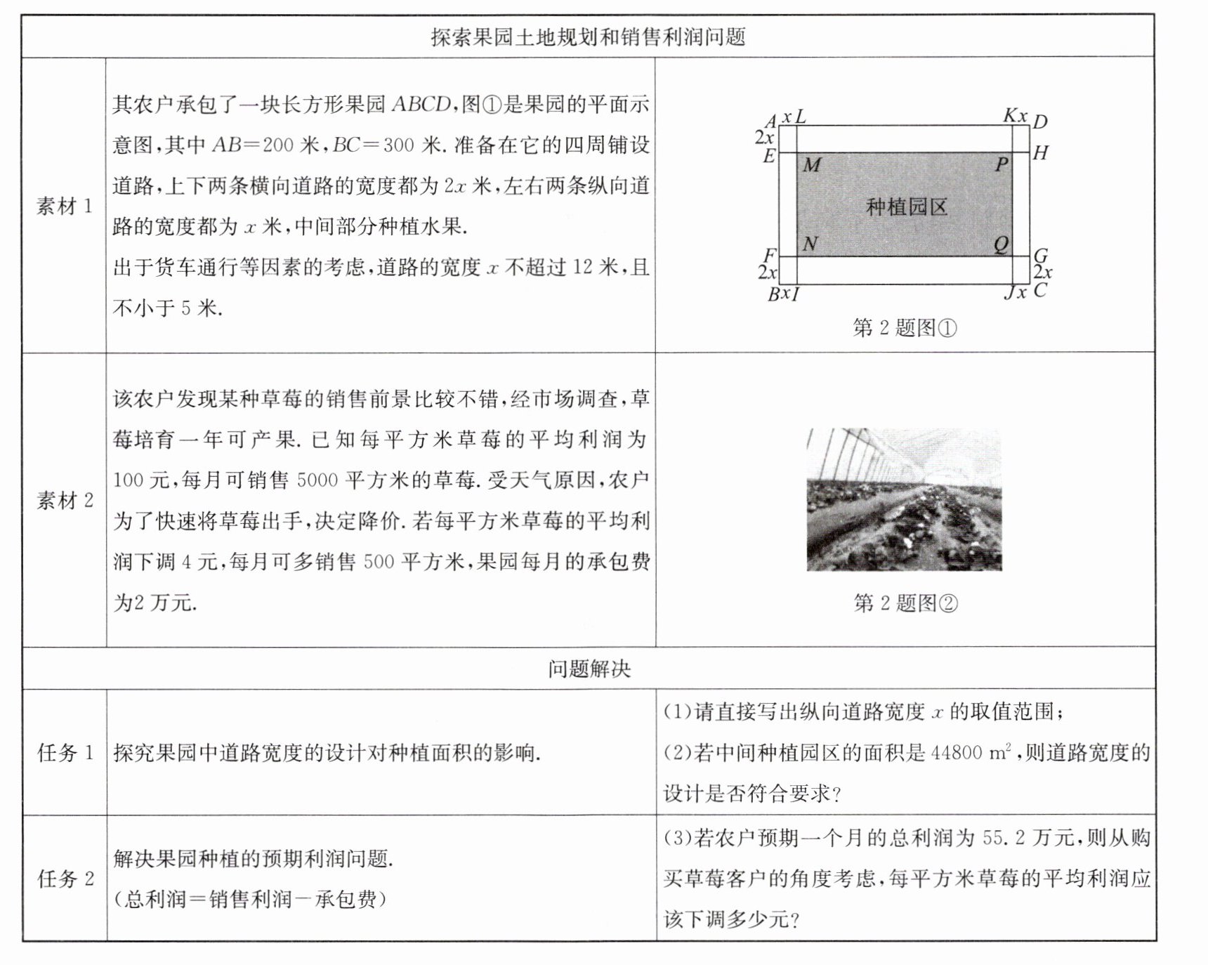 (2)解:种植园区的长为(300-2x)米,宽为(200-4x)米,根据题意得(300-2x)(200-4x)=44800,整理得x²-200x+2800=0,解得x₁=10,x₂=190(舍去),