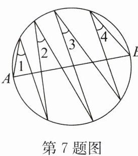 7.(2024·连云港)如图,AB是圆的直径,$∠1,∠2,∠3,∠4$的顶点均在AB两侧的圆弧上,$∠1,∠4$的一边分别经过点A,B,则$∠1+∠2+∠3+∠4= $