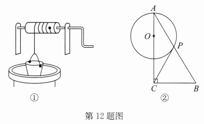 12. (2024·天宁区模拟)辘轳(如图①)是从杠杆演变来的汲水工具,图②是从辘轳抽象出来的几何模型,在$Rt\triangle ABC$中,$\angle ACB= 90^{\circ}$,O是AC边上一点,以OA为半径的$\odot O$与AB相交于点P,已知$CP= CB$.