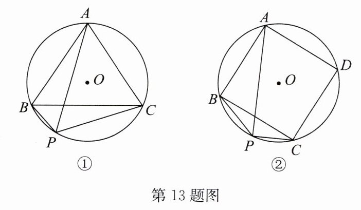 13.(1)如图①,$△ABC是\odot O$的内接正三角形,P为劣弧$\widehat {BC}$上一动点.求证:$PA= PB+PC;$