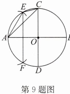 9. 如图,在$\odot O$中,如果作两条互相垂直的直径AB,CD,那么弦AC是$\odot O$的内接正方形的一边;如果以点A为圆心,以OA为半径画弧,与$\odot O$相交于点E,F,那么弦AE,CE,EF分别是$\odot O$的内接正六边形、正十二边形、正三角形的一边,为什么?