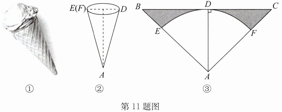 11. 如图①,某种冰激凌的外包装可以视为圆锥,如图②,它的底面圆直径$ED与母线AD长之比为1:2$. 制作这种外包装需要用如图③所示的等腰三角形材料,其中$AB = AC$,$AD\perp BC$. 将扇形$AEF$围成圆锥时,$AE$,$AF$恰好重合.
