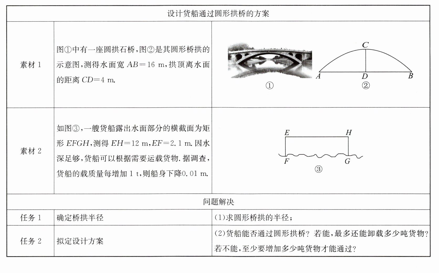 (2)设货船顶部距离水面$x$米时刚好能通过。此时货船顶部两端点到圆心的距离为半径$10$米,货船宽$EH = 12$米,半宽为$6$米,圆心到水面距离为$R - CD=10 - 4=6$米,圆心到船顶距离为$6 - x$米。在直角三角形中,由勾股定理得$6^2 + (6 - x)^2 = 10^2$,解得$x = 2$($x = 10$舍去)。货船现露出水面$EF = 2.1$米,$2.1>2$,能通过。需下降$2.1 - 2=0.1$米,最多还能卸载$0.1÷0.01 = 10$吨。