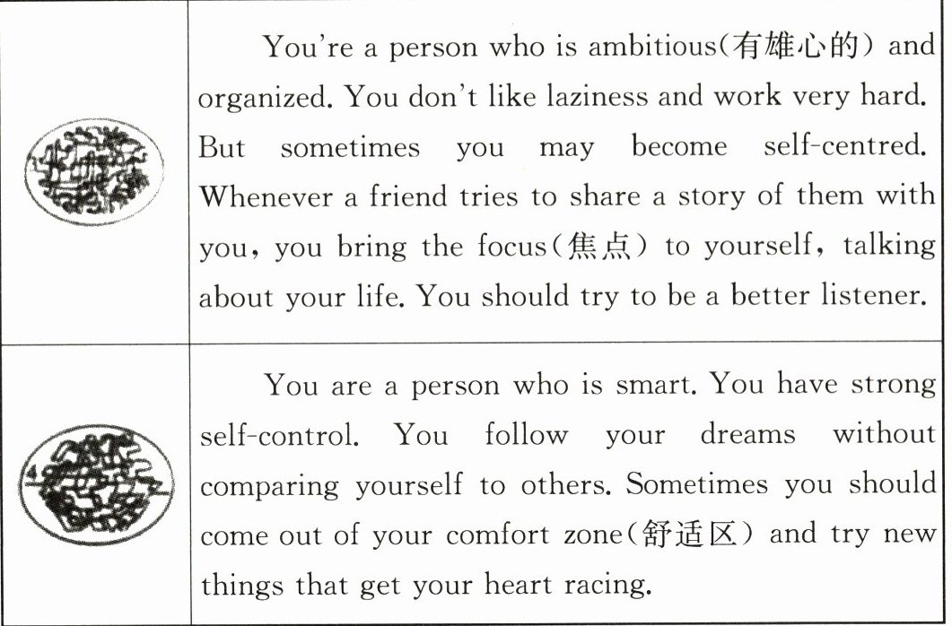 1. C 【点拨】根据表格第三栏中的“You don't like laziness and work very hard. But sometimes you may become self - centred... You should try to be a better listener.”可知,应该努力做一个更好的倾听者,选项 C“当他的朋友有困难时,做一个更好的倾听者。”符合要求。故选 C。