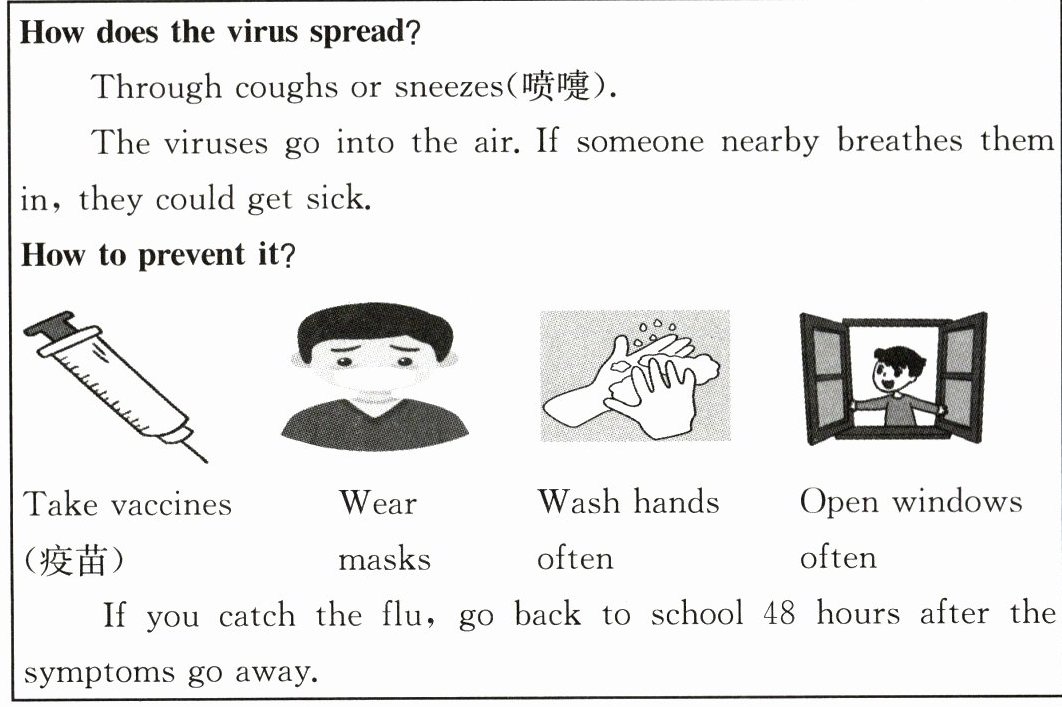 1. C【点拨】根据“Symptoms(症状) of Influenza A”部分的内容可知,甲流的症状有咳嗽、发烧、头疼和咽痛,没有牙疼。故选 C。
