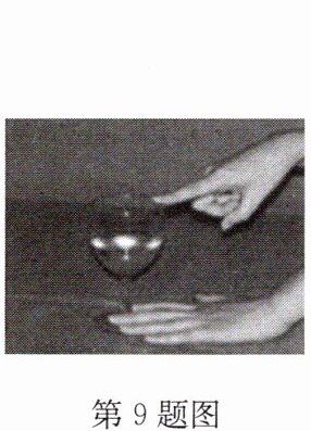 9. 如图所示,把一个装有少量水的高脚酒杯放在水平台上,一只手按住酒杯的底座,将另一只手的手指润湿后沿着杯口边缘摩擦,使其发出声音.改变酒杯中的水量用同样的力去摩擦酒杯,仔细倾听会发现,发出声音的高低会发生变化.针对这一现象大家提出了几个问题,其中较有价值又可进行探究的问题是(