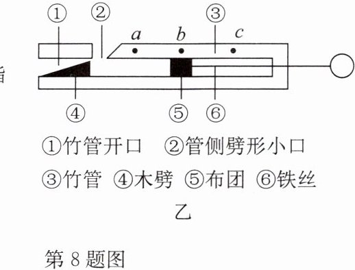 8. 某同学在课余时自制了二胡和简易笛子.如图甲,演奏二胡时,手指在琴弦上来回移动,是通过改变