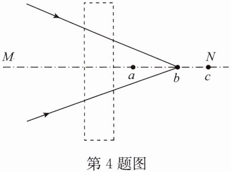 4. 如图所示,一束光会聚于 b 点,在虚线区域内放入甲透镜后,光会聚于主光轴 MN 上的 c 点;在虚线区域内换放乙透镜后,光会聚于主光轴 MN 上的 a 点(a、b、c 三点在同一条直线上).则甲透镜是