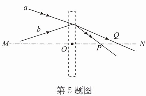 5. 如图所示,虚线框内为一透镜,MN 为透镜的主光轴,O 是透镜光心,a(双箭头)和 b(单箭头)是射向透镜的两条光线.已知光线 a 通过透镜之后与 MN 交于 P 点,光线 b 通过透镜之后与 MN 交于 Q 点.该透镜是