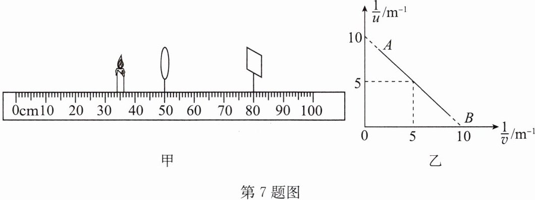 (2)如图乙,线段 $ AB $ 为凸透镜成像的物距倒数和像距倒数的对应关系,则凸透镜的焦距为