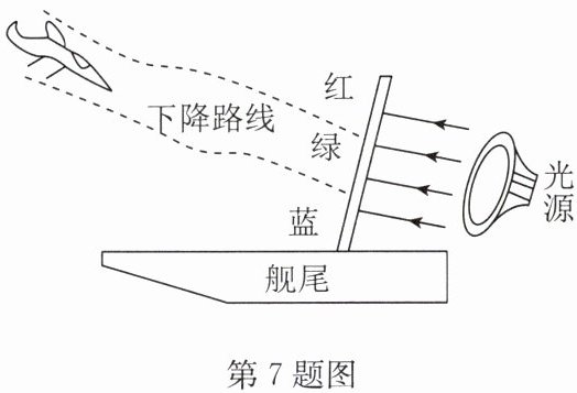 7. (2024·沛县月考)我国目前已经掌握了舰载机夜间起降技术,其中一种方法是在航母舰尾装上如图所示的装置,打开光源,照射到由红、绿、蓝三种颜色组成的透明玻璃板上,对着即将降落的舰载机. 当飞行员看到的玻璃颜色为红色时,说明飞机高于正确降落路线;当看到的玻璃颜色为蓝色时,说明低于降落路线;当看到的玻璃颜色为绿色时,说明路线正确. 则该装置的光源必须是 (