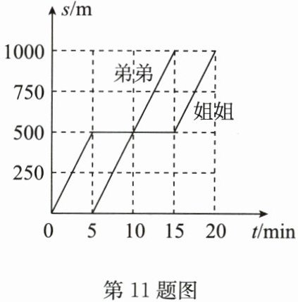11. 姐姐和弟弟在同一所学校上学,某一天吃过早餐后,姐弟俩约定从小区门口出发去学校大门口会合. 作出他们的路程与时间的关系图像分别如图中的两条实线所示,弟弟的图线为直线. 下列判断正确的是(