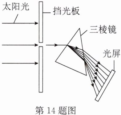 14. 如图所示,让一束太阳光通过挡光板的狭缝照射到三棱镜的一个侧面上,用光屏接收从三棱镜的另一侧出射的光线.